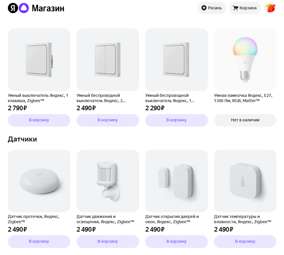 содержит все актуальные модели умных устройств. Девайсы разделены на категории: Станции, освещение, датчики, хабы и пульты, розетки и телевизоры.