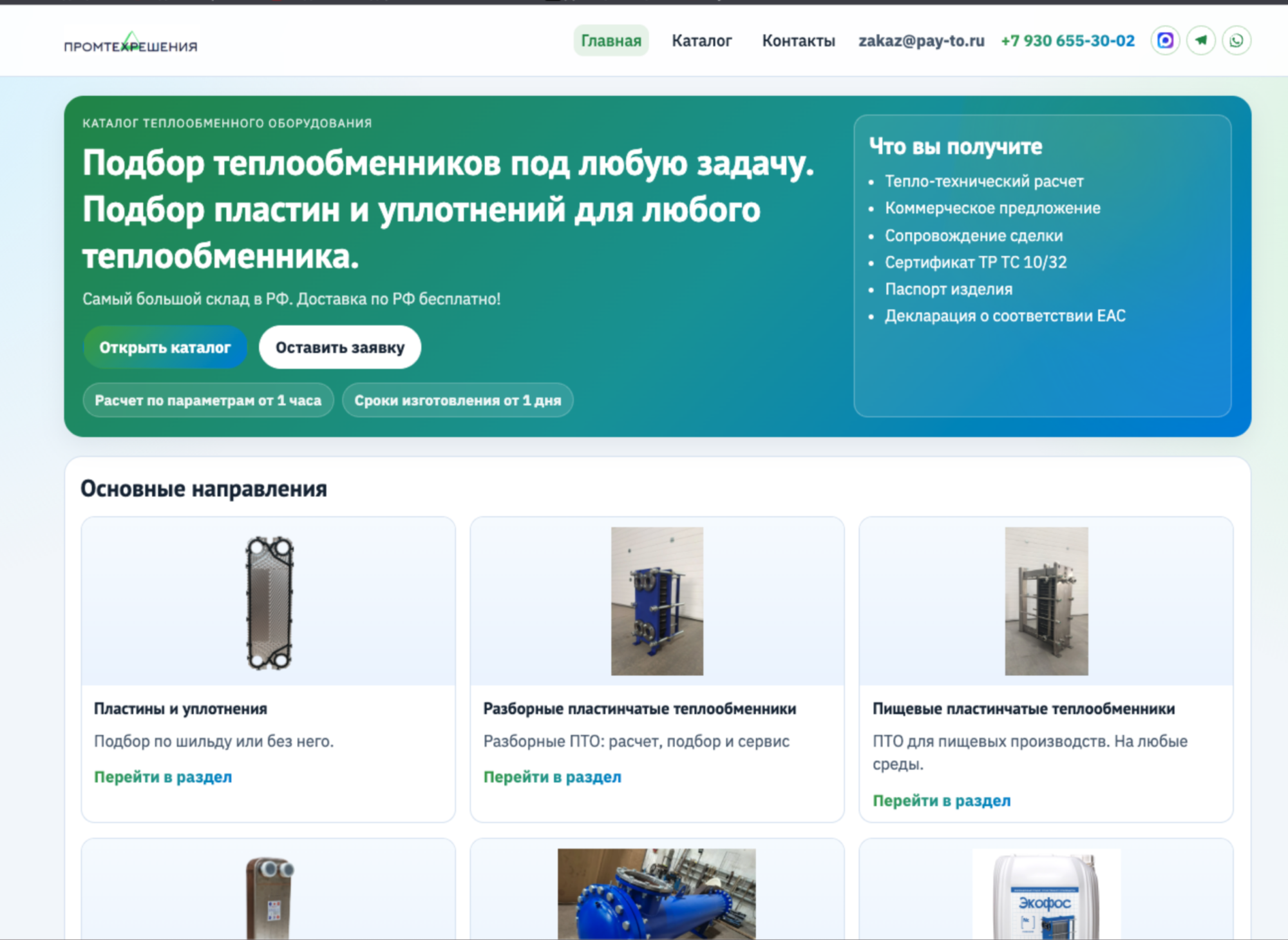 Разработали современный и функциональный сайт для компании "Промтехрешения", производящей теплообменное оборудование. Удобный интерфейс, адаптивность, быстрая загрузка и грамотная SEO-оптимизация помогли повысить видимость и привлечь новых клиентов. Результат подтвердил успех сотрудничества и укрепил доверие заказчиков.